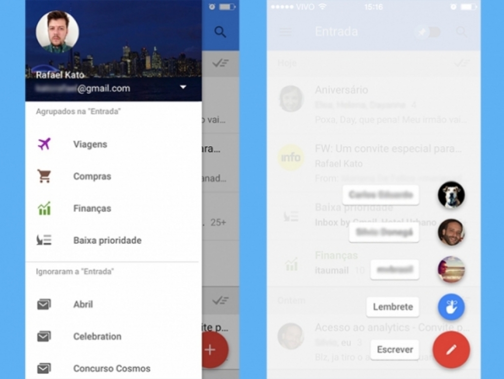 Em testes realizados por INFO, quando o login de uma conta do Gmail foi feito no Inbox, o aplicativo criou automaticamente quatro categorias novas de e-mails.