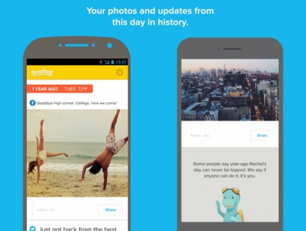 Timehop é um aplicativo que conecta-se a diversas redes sociais do usuário e mostra todas as ações nelas no mesmo dia, só que nos anos anteriores.