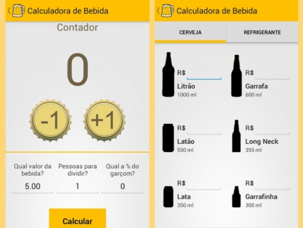 Em seguida, é só digitar o preço de cada uma das opções — lata, latão, long neck, etc. — e clicar no botão “Calcular”, localizado na parte inferior da tela.